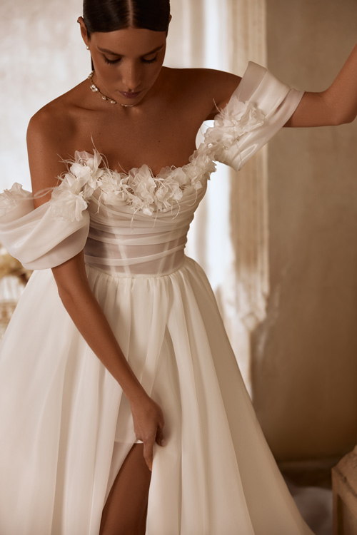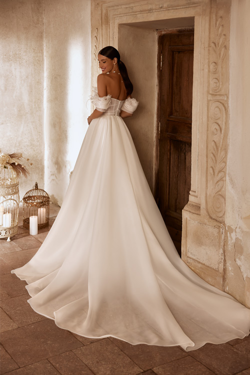 Model Carver zaujme hneď na prvý pohľad svojimi odhalenými ramenami a nadýchanými rukávmi, ktoré pôsobia neodolateľne jemne a ženský. Rukávy sú navrhnuté tak, aby ladne obopínali ramená a dodali nevestinmu vzhľadu romantický nádych. Ide o detail, ktorý pôsobí sviežo, štýlovo a zároveň zachováva klasickú svadobnú eleganciu.