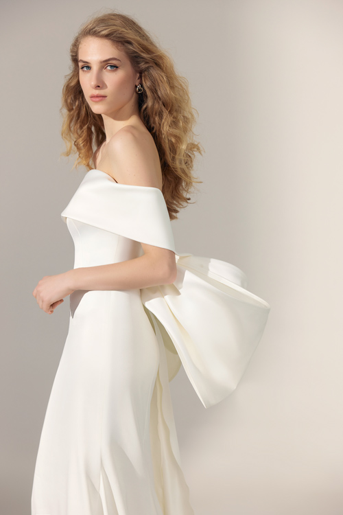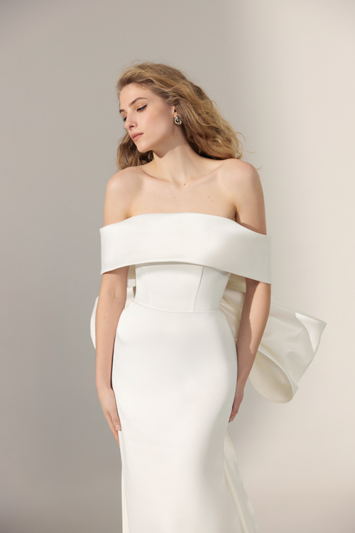Jedným z najvýraznejších prvkov modelu Harley je elegantný výstrih mimo ramien, ktorý jemne odhaľuje ramená a kľúčnu kosť. Tento detail dodáva nevestinmu vzhľadu zmyselnosť a ženskosť bez potreby doplnkov. Vďaka precízne tvarovanému živôtiku s hladkým prechodom do pása šaty pôsobia štíhlo, čisto a harmonicky.
