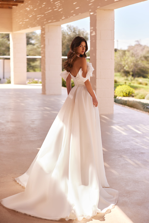 Ramienka vo forme voľne padajúcich rukávov zvýrazňujú línie ramien a dekoltu. Sú z rovnakého jemného materiálu ako sukňa a dajú sa kombinovať aj s odnímateľnými balónovými rukávmi pre ešte výraznejší vzhľad. Táto variabilita umožňuje neveste meniť svoj štýl počas dňa.