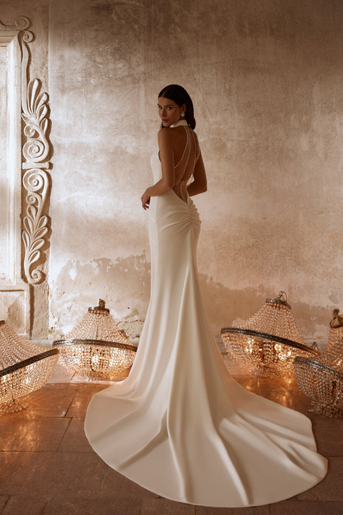 Hilda je ideálnou voľbou pre ženy, ktoré hľadajú niečo výnimočné v jednoduchosti. Jej moderný halter výstrih pôsobí elegantne a decentne, zatiaľ čo odhalený chrbát dodáva odvahu a sebavedomie. Tieto svadobné šaty vyžarujú harmóniu medzi eleganciou a zmyselnosťou – perfektné pre moderné svadby s osobným štýlom.