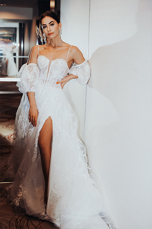 Strih šiat krásne zvýrazňuje siluetu – živôtik spevňuje a tvaruje poprsie, zatiaľ čo sukňa s rozparkom odhaľuje nohu pri chôdzi. Ide o dokonalú rovnováhu medzi odvážnosťou a vkusom, medzi jemnosťou a sebavedomím. Electra sú ideálne svadobné šaty pre nevestu, ktorá chce zažiariť.