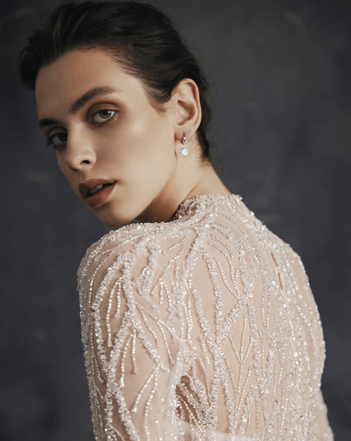Celé šaty sú bohato zdobené ručne vyšívanými korálkami a flitrami v geometrických a prírodných motívoch. Každý steh na tkanine vytvára jedinečný ornament, vďaka ktorému sa šaty trblietajú pri každom kroku. Zdobenie siaha od dekoltu až po vlečku, čím vytvára súvislý efekt žiarivého lesku.