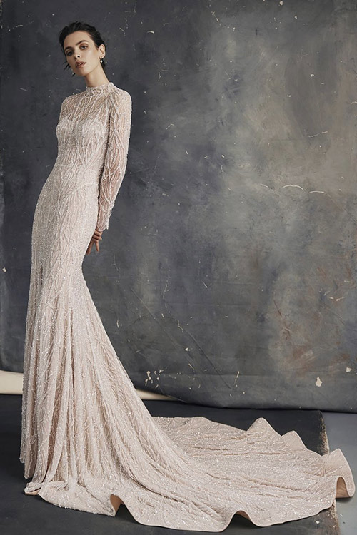 Model Fanny zaujme elegantným vysokým golierom, ktorý nádherne predlžuje krk a dodáva šatám aristokratický nádych. Dlhé rukávy z priehľadnej látky, pokryté výšivkami, sú ideálne pre svadby počas chladnejších mesiacov alebo na slávnostné ceremónie s dôrazom na dôstojnosť a štýl.