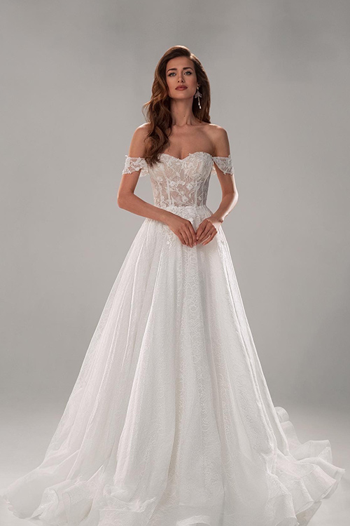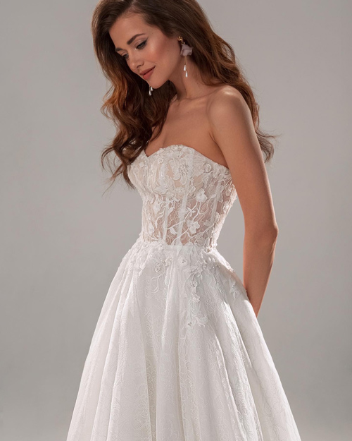 Srdiečkový korzet týchto šiat je navrhnutý tak, aby lichotil postave a zvýraznil ženské krivky. Transparentný čipkovaný materiál dodáva outfitu ľahkosť a vzdušnosť, pričom vytvára pôsobivý efekt vrstvenia. Odnímateľné ramienka umožňujú nevestám flexibilitu – môžu si vybrať medzi romantickým off-shoulder vzhľadom alebo odhalenými ramenami.