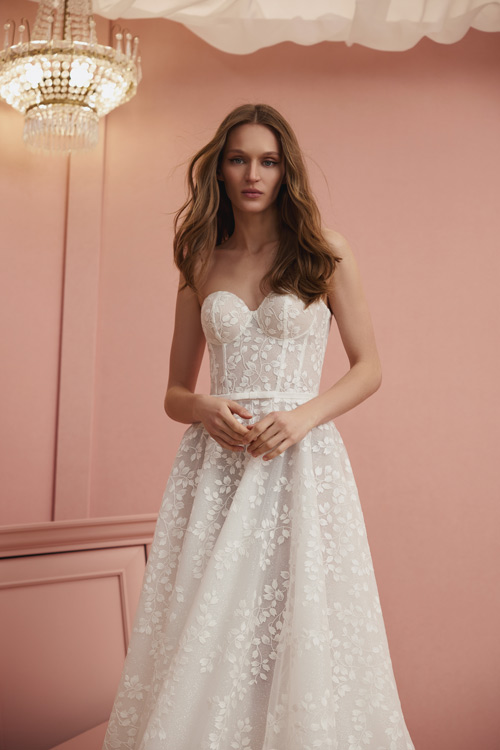Najvýraznejším prvkom modelu Velours je nádherná čipka s 3D kvetinovými motívmi, ktorá pokrýva celý živôtik a časť sukne. Každý lístok a kvet je ručne prepracovaný, čo šatám dodáva hĺbku a textúru. V kombinácii s jemným trblietavým tylom vytvára tento materiál efekt, ktorý pôsobí nežne a zároveň luxusne. Šaty tak pri svetle pôsobia, akoby jemne žiarili.
