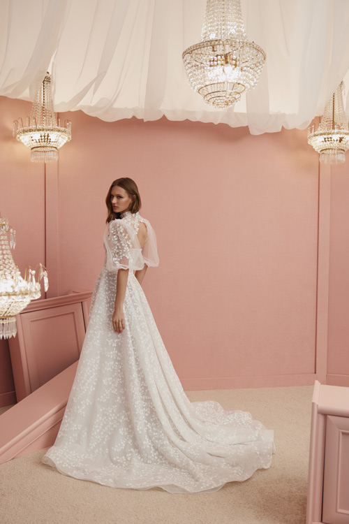 Model Velours ponúka moderný prvok – odnímateľné rukávy z transparentného tylu. Počas obradu pôsobia romanticky a étericky, zatiaľ čo po ich odopnutí sa šaty premenia na odvážnejší, večerný model. Tento detail prináša nevestám možnosť prispôsobiť svoj svadobný vzhľad podľa nálady či priebehu dňa, bez potreby meniť šaty.